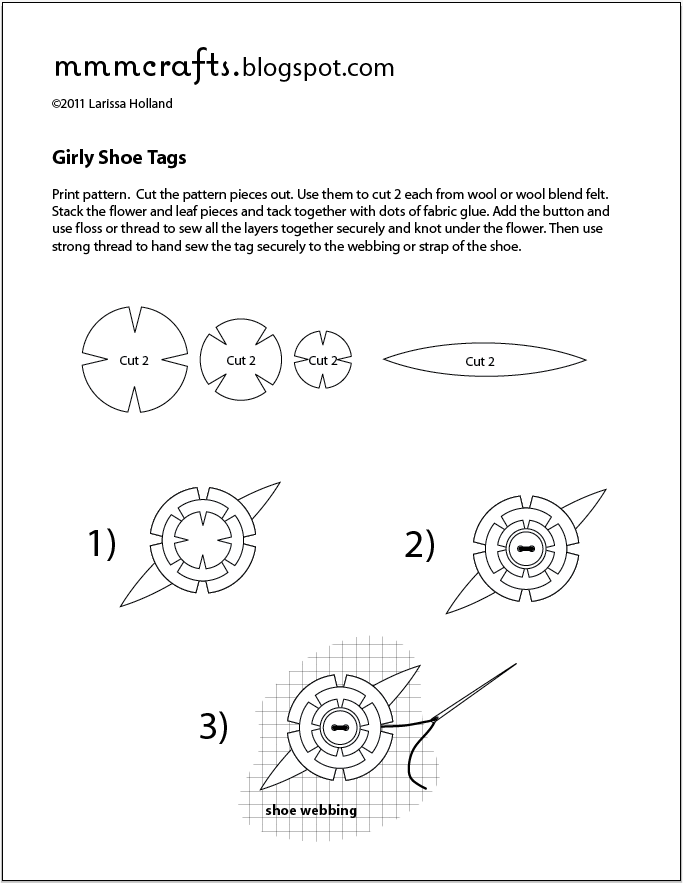 It’s a quick and easy project and I thank myself for it every time they get dressed. You could also use an alphabet bead instead of a button for each girl’s initial. If your shoes lack the obliging fabric or webbing inserts, you could always opt to sew them around the strap or add a clip. If you would like to make some girly shoe tags like these, here’s the simple pattern PDF to download: