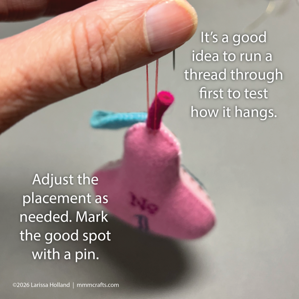I’d start by using a test thread through the loop spot to make sure you will like the way the ornament hangs. This is more of an issue with ornaments that are asymmetrical. If you need to make any adjustments in placement, do that now and mark your ideal spot with a pin.