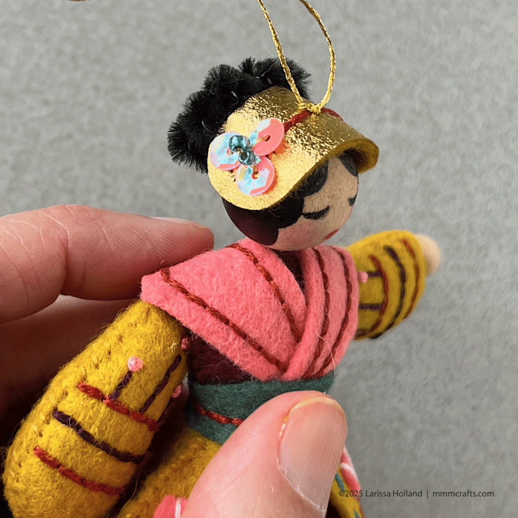 I layered one 4 mm Benzie Rainbow Iridescent sequin and one Rose Quartz bead on the skirt center stamen, and two single Rose Quartz beads on the remaining stamens. I used three 5 mm pink sequins and three Benzie Teal beads on her cap.