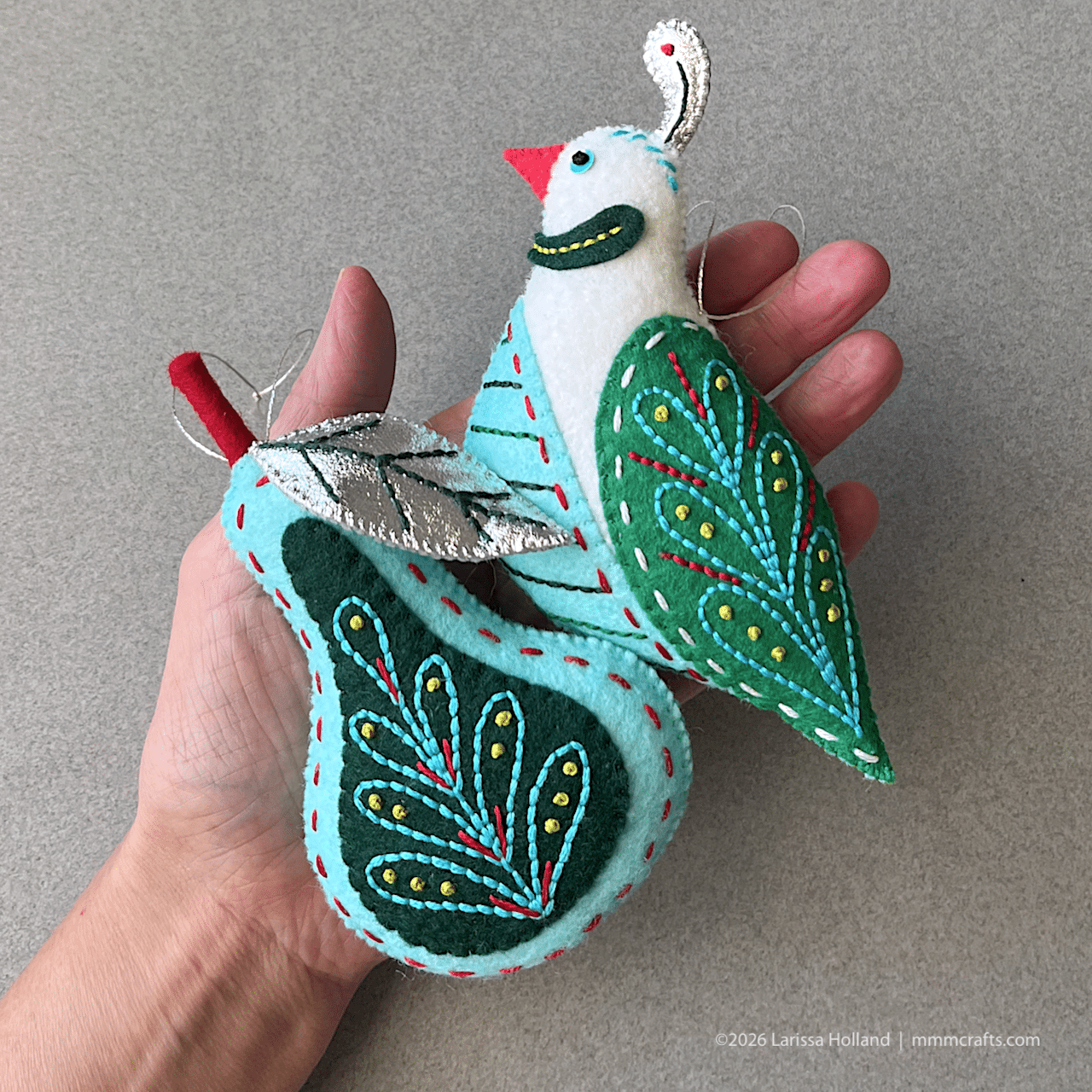 I added some red leaf veins on the pear inset embroidery that are not included in the pattern. Just on the partridge, I used a 5 mm aqua sequin behind the eye. I meant to add a translucent iridescent one under the knot on the plume, and I forgot. I could have used a silver metallic sequin for the eye instead of aqua, so do as you like.