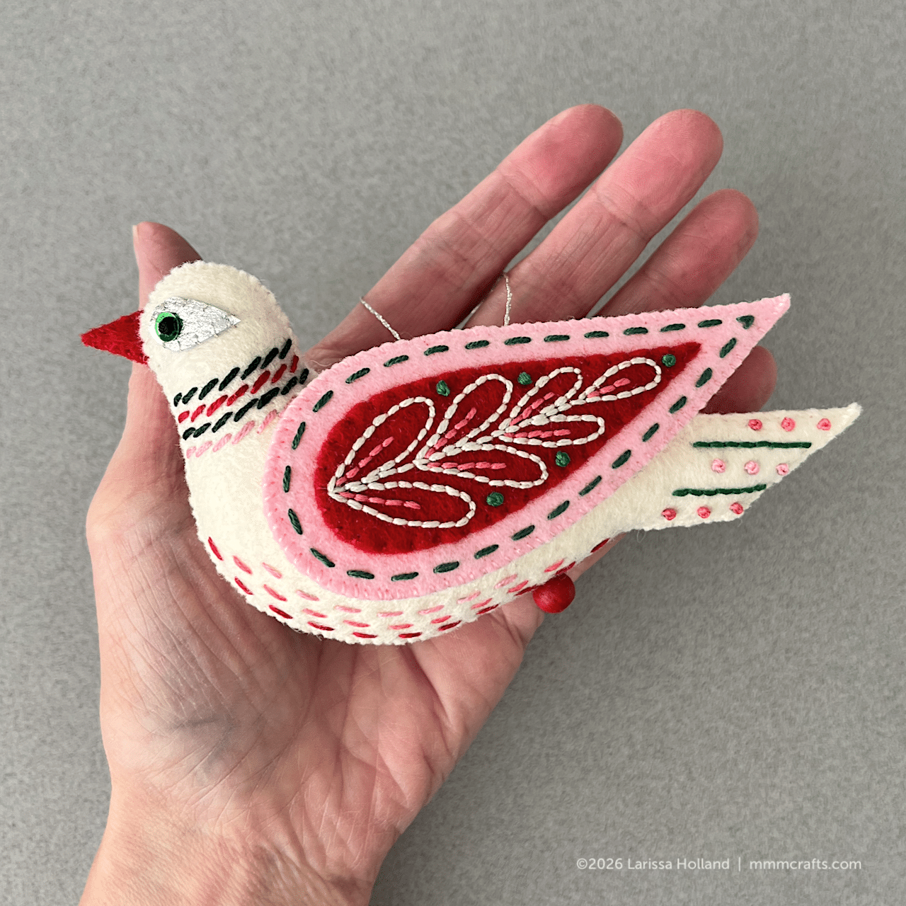 My Turtle Dove is finished! I think I like it? I’m still duking it out with this cream/green/red/silver color palette. I’m not comfortable with it at all, and I keep second guessing every decision. More than the usual I mean. It’s kind of driving me crazy. I keep reaching for other colors to add into the palette and have to talk myself down. I have a couple of yellows in the palette intended as unifying accent colors, but every time I try to use one, it just seems wrong. I want to include a citron green felt so bad. I might boot the yellows and sub it in. Lydia originally wanted to include a lemony yellow, but I rejected it. Citron is close to lemon. Right? Your answer is yes.