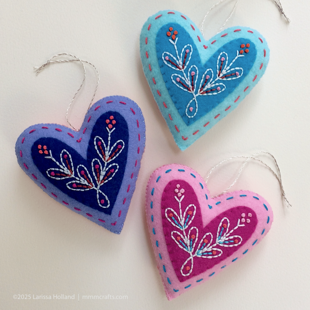 SHOWN: Yellow heart is made with Felt On The Fly Gold color palette (part of my curated Jewel colorway) and the pink/purple/blue hearts are made with Benzie Design Twelve Days color bundle No. 6.