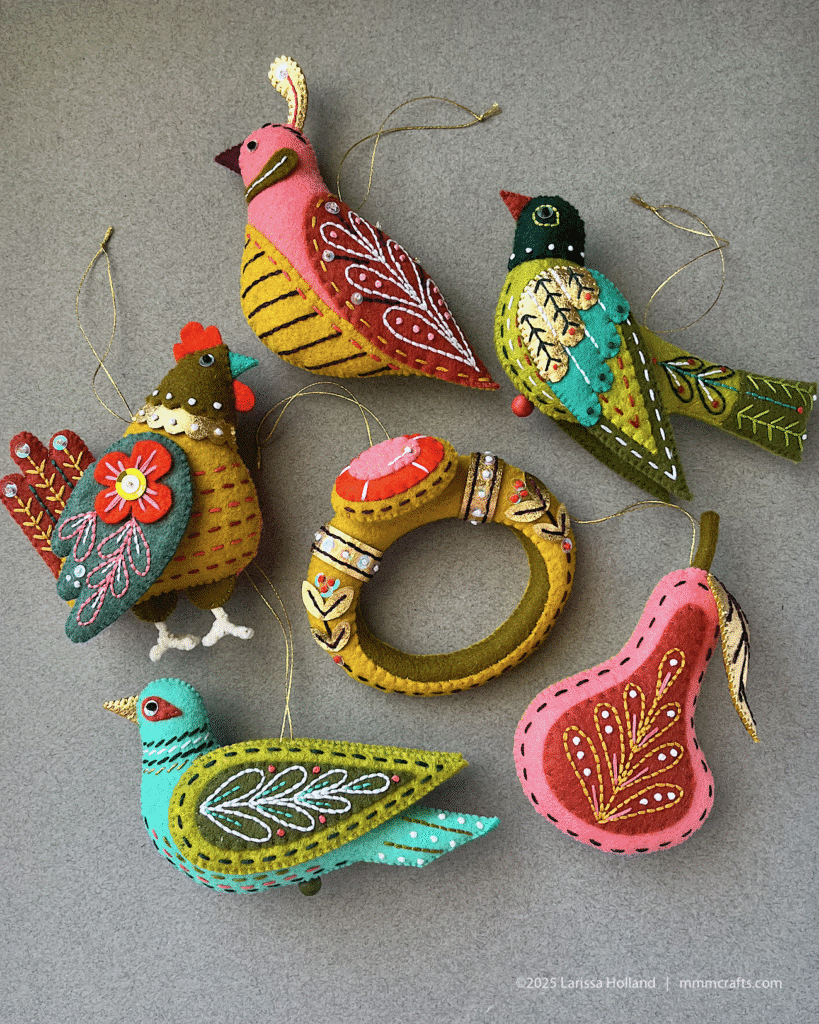 This month I managed to make my TDITM challenge ornament with plenty of days to spare. I had fun revisiting this pattern as it has been years since I made a Gold Ring. It’s a fairly quick make with relatively simple embroidery. I fancied this one up with metallic gold felt accents and some sequins.