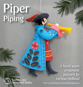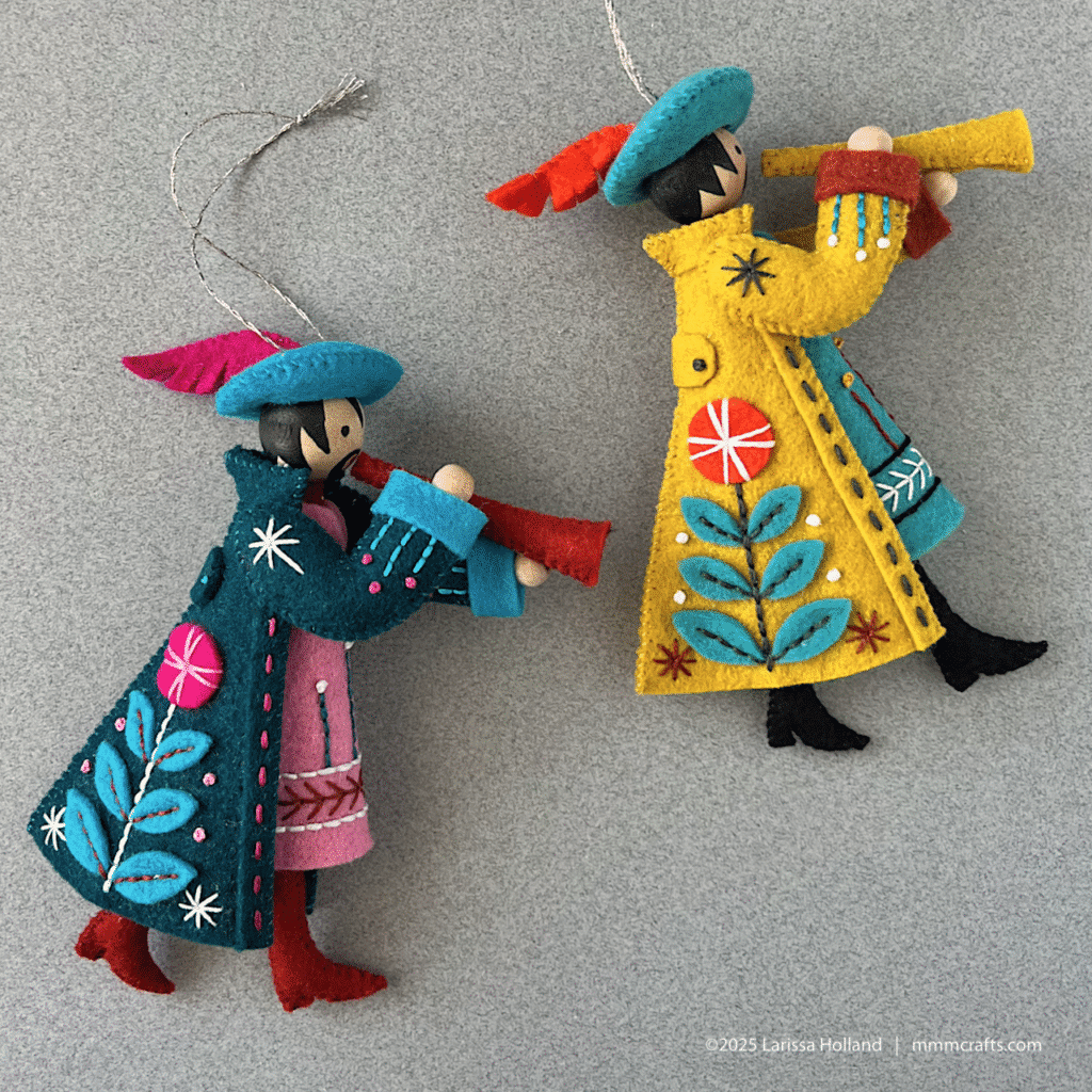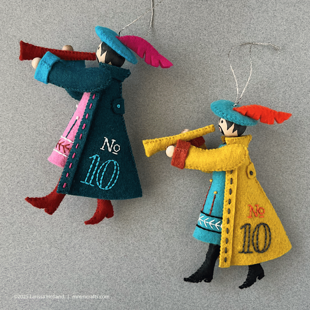 Mr Piper is presented in side view, like Lord a-Leaping. I think his feathery hat is fun! Reminder: if you are a bit nervous about making his head please review my handy head tutorial, then look for the detailed instructions in the pattern.